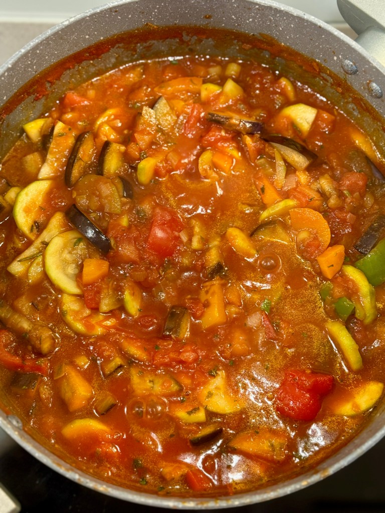 9. Return the aubergines and courgettes to the pot and let it simmer on low-medium heat for about 25 minutes or until the vegetables are soft.